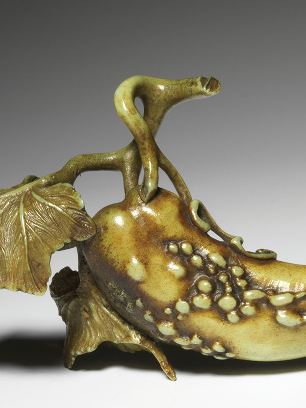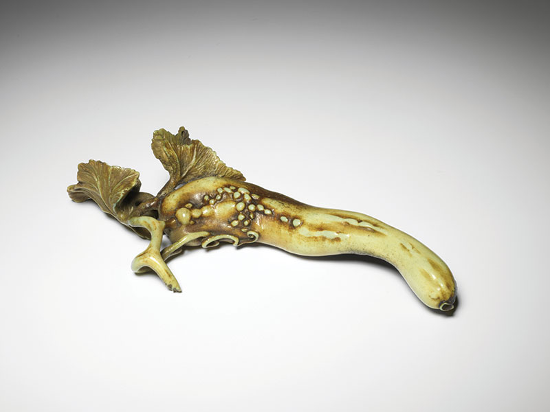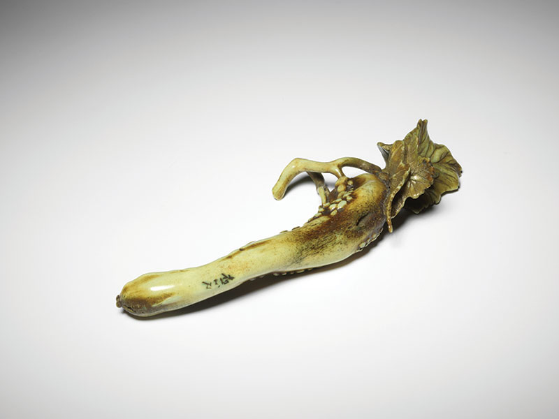 A stag antler okimono in the shape of a cucumber, the skin of the long fruit pimpled in irregular patches. Two thin and papery leaves curl as they begin to dry out while delicate curling tendrils shoot from the twisted stem. The antler is stained green, enhancing its naturalistic appearance.