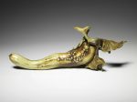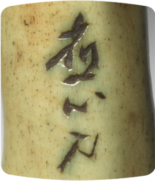 Oshin was a highly regarded and successful artist producing objects for the Sencha style of tea ceremony. His brilliance lay in his ability to imagine a hidden form within a section of natural material, this cucumber being a fine example of such skill. Sencha enjoyed great vogue from the Meiji era, right up to the outbreak of the Asia Pacific war in 1941. At that time Oshin moved to Northern Kyoto for safety but the popularity of Sencha dwindled and in his latter years he was obliged rely on the charity of friends, paying them with carvings in the absence of financial wherewithal.