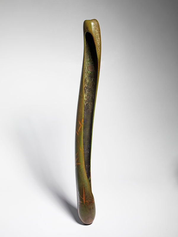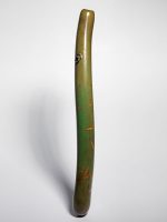 Unsigned stag antler kiseruzutsu - [SOLD]circa 1860 An unusual stag antler kiseruzutsu of senryu-zutsu form with a design of bamboo leaves that has been created by resist staining in green dye. A metal loop forms the himotoshi. The opening is carved to follow the natural twist of the antler. Unsigned Circa 1870 Length: 27.5cm BAN8763